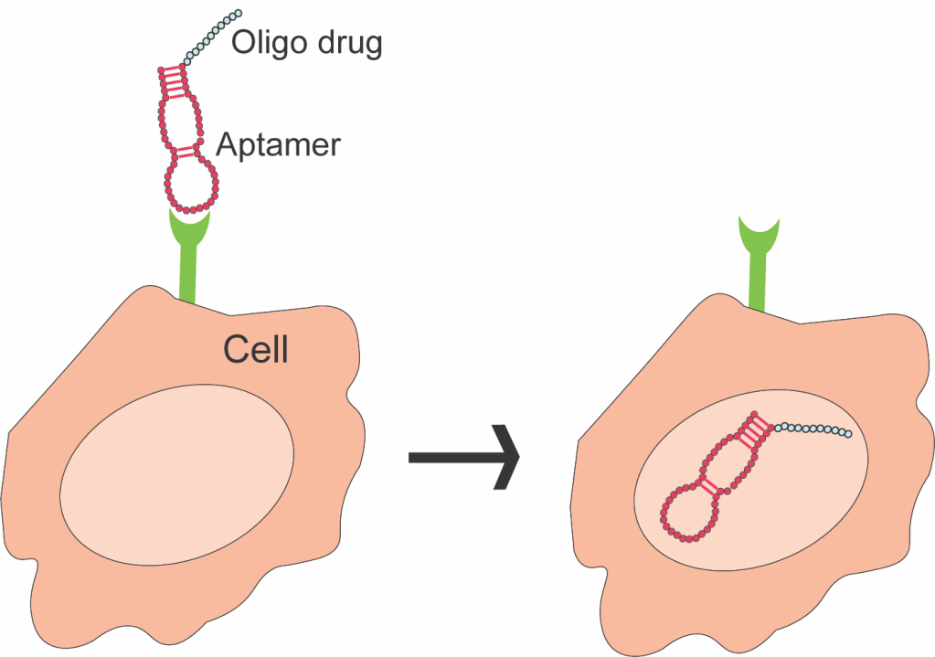 Recently several different oligonucleotide drugs, primarily siRNA drugs and antisense oligonucleotide (ASO) drugs, have been clinically approved. Most of these drugs are conjugated to a sugar ligand (GalNAc) that targets liver cells and efficiently delivers the oligonucleotides to the liver. There currently aren’t efficient methods to deliver these oligonucleotide drugs to other organs. We’re exploring the use of aptamers specific for non-liver cell types to deliver these oligonucleotide drugs to other tissues.