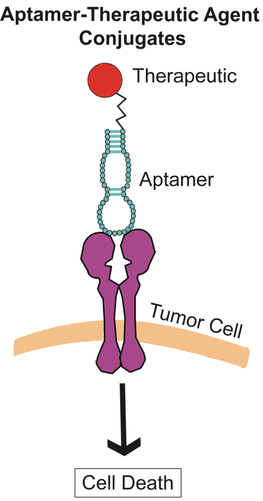 Traditional chemotherapy drugs cause numerous unwanted side effects due to drug accumulation in normal tissue; only a very small amount of the drug actually reaches the tumor. Recent advances to prevent chemotherapy accumulation in normal tissues have primarily relied on antibody drug conjugates (ADCs), in which highly toxic chemotherapeutics are conjugated to tumor-specific antibodies. These antibodies bind to receptors on tumor cells, more specifically delivering the chemotherapy drug to the tumor and keeping it away from non-target tissues. However, as biological products, antibodies must be produced by cell-based systems, are difficult to chemically modify with precision and require humanization for clinical use. Aptamers, small nucleic acid ligands, are an attractive alternative to therapeutic antibodies. Aptamers do not require humanization, are easily amenable to chemical synthesis and modification and maintain antibody-like affinities and specificities at a fraction of antibody size. We are selecting aptamers against different tumor targets and developing them into targeting ligands to deliver drugs specifically to tumors.
